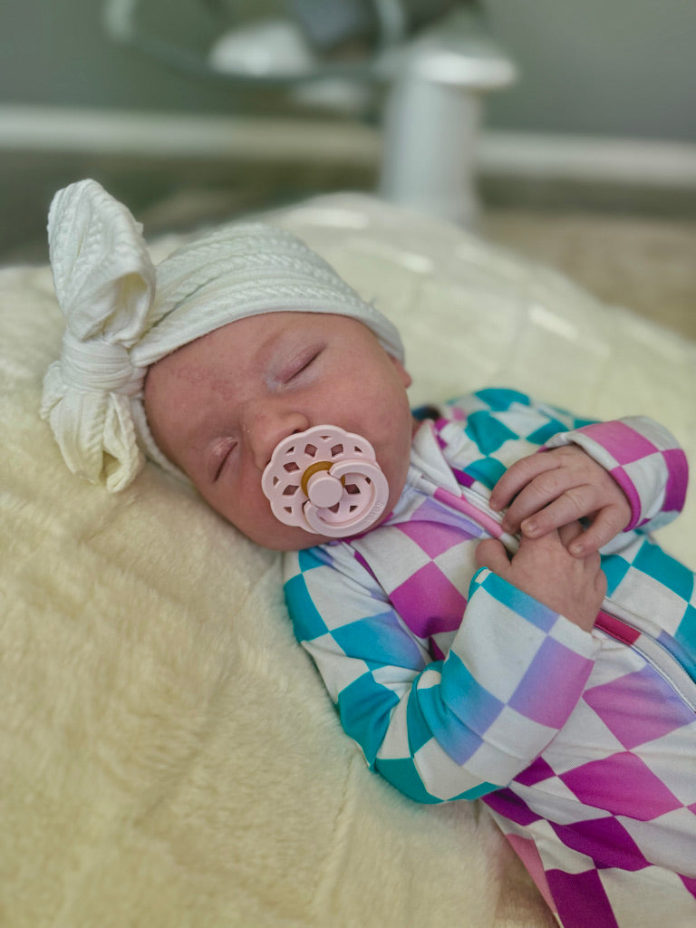 This versatile outfit can be worn as a footless romper or fold over the cuffs and wear it as a footie pajama! Fold over mittens can be found on sizes newborn through 6-12 months.
